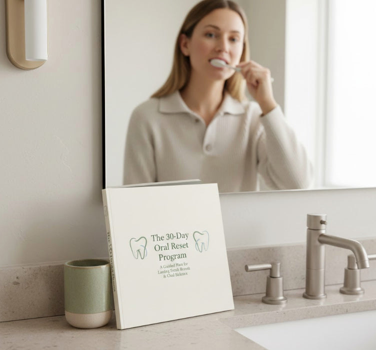 The 30-Day Oral Reset Program is a step-by-step, clinical-style plan designed to help you reduce odor-producing bacteria, support gum comfort, and build daily habits that last.